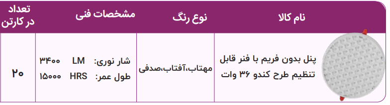 پنل 36 وات لیان نور مدل کندو همانطور که از نام آن مشخص است، دارای رفلکتوری شبیه به ساختار کندوی عسل است و نور با کیفیتی را با درخشندگی بالا و بدون خیرگی ساطع می کند. پنل 36 وات لیان نورمدل کندو دارای فنر متحرک با قابلیت تنظیم است که به صورت گرد طراحی شده و از آن ها می توان در انواع فضاها با کاربری های مختلف جهت نورپردازی عمومی و موضعی استفاده نمود. از دیگر ویژگی های پنل 36 وات مدل کندو لیان نور می توان به داشتن درایور جدا و سهولت تعویض آن، مصرف پایین انرژی، طول عمر بالا بدون افت کیفیت نوردهی، نصب آسان از طریق گیره های فنری کشویی، مقاومت بالا در برابر تعداد دفعات خاموش و روشن شدن، قابلیت روشن شدن سریع و کاهش تولید گازهای گلخانه ای اشاره نمود.