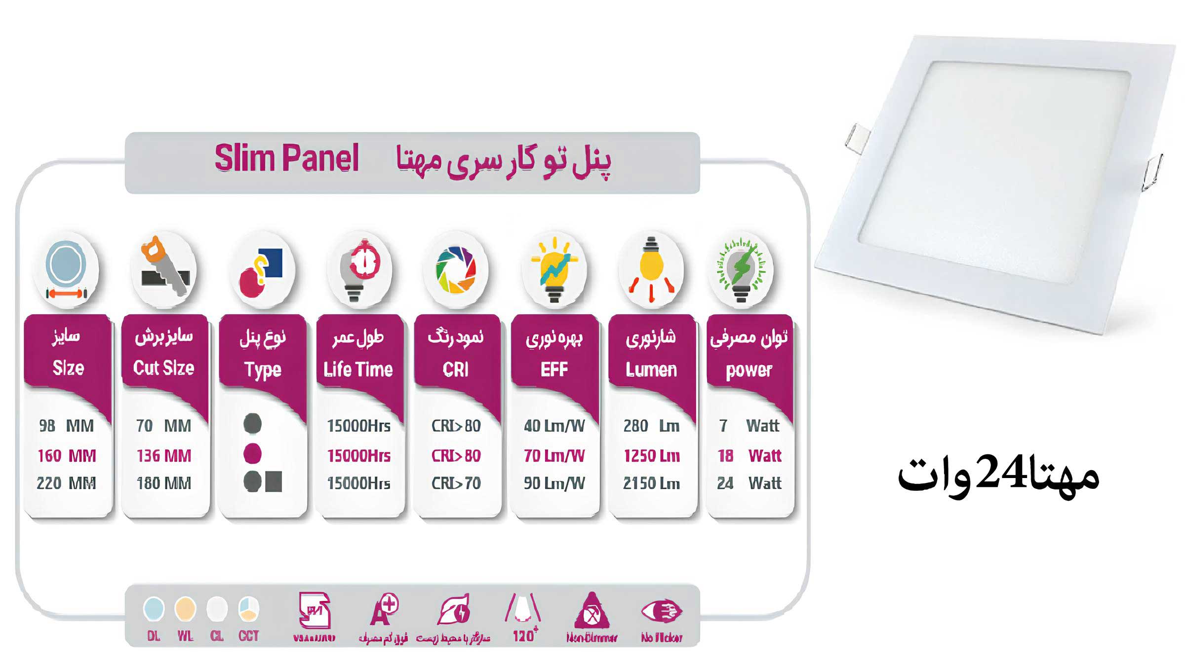 پنل 24 وات توکار سری مهتا مربع لیان نور