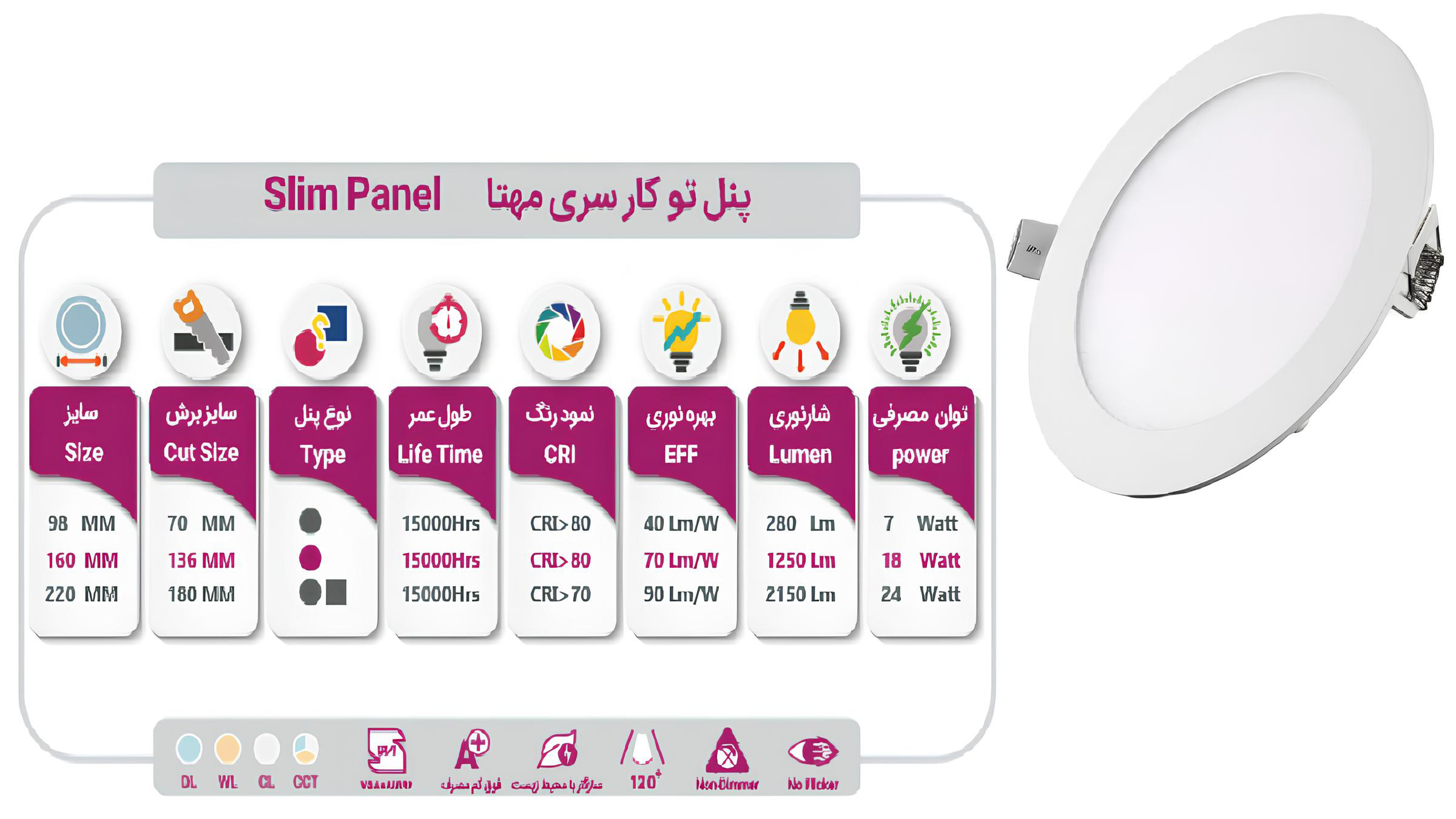 این چراغ ال ای ادی سقفی با شاخص نمود رنگ 80< توانایی خوبی در نمایش دقیق رنگ ها دارد و موجب بهبود جلوه بصری محیط می شود و نور کافی و یکنواختی را برای محیط فراهم می کند. این محصول جایگزینی برای چراغ ها و لامپ های قدیمی است که علاوه بر طراحی زیبا و ایجاد کیفیت نور بهتر به دلیل استفاده از لامپ های ال ای دی بسیار کم مصرف بوده و دارای رده انرژی A+ می باشد و در مصرف انرژی بسیار صرفه جویی می شود و طول عمری که برای این محصول در نظر گرفته شده است 15000 ساعت می باشد. برند لیان نور پنل توکار گرد سری مهتا را با توان های مختلف و متنوع تولید می کند که نمونه های دیگر این محصول در سایت موجود است.