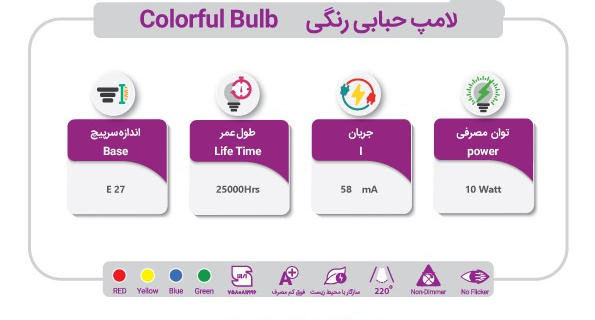 امپ ال ای دی حبابی 10 وات رنگی، با توان مصرفی 10 وات نوری معادل یک لامپ رشته ای قدیمی 60 واتی تولید می کند و نور تولیدی چراغ ال ای دی حبابی 9 وات رنگی 900 لومن می باشد. این لامپ متناسب با سلیقه و نوع مصرف انتخاب می شود. شاخص رنگ نمایی مقیاسی بین 0 تا 100 درصد می باشد که نشان دهنده آن است یک منبع نور چگونه و با چه دقت و تفکیکی از خود نور ساطع شده و در نهایت نوری که بازتاب می شود چه میزان از رنگ واقعی جسم را به چشم ما نشان می دهد. لازم به ذکر است که شاخص رنگ نمایی این لامپ بیش از 82 درصد می باشد.