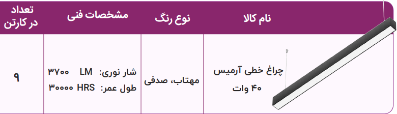 چراغ آویز خطی آرتمیس 40 وات با بهره گیری از خلاقیت و نوآوری، و استفاده از دانش روز دنیا، توانسته است به یکی از گزینه های برتر در بازار تبدیل شود. چراغ آویز لیزر بلید مدل SH-6804-48W ، ترکیبی بی نظیر از پیشرفته ترین تکنولوژی روز دنیا و طراحی مدرن است که به فضا و محیط مد نظر شما جلوه ای خاص و جذاب می دهد. نوری که از این چراغ خطی در محیط اطراف ساطع می شود نوری یکنواخت و بدون فلیکر است که باعث خستگی چشم نمی شود.چراغ آویز خطی آرتمیس 40 وات با توان 40وات و شار نوری 3700لومن فضایی منحصر به فرد و مدرن را در محیط ایجاد کند.