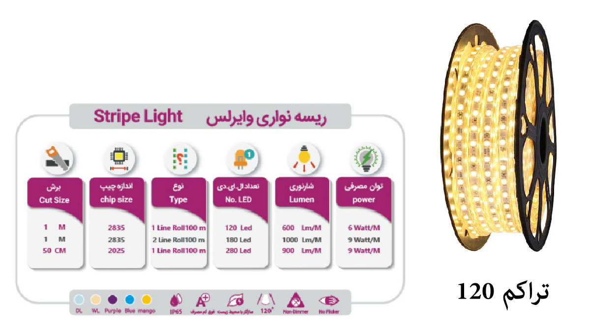 ریسه های ال ای دی در دسته نور پردازی های جدید و به روز هستند که بیشتر جنبه تزئینی و دکوری دارند. ریسههای نواری وایرلس برای افرادی که به دنبال نورپردازی هوشمند، جذاب و راحت هستند، انتخابی عالی می باشند. شرکت لیان نور که در زمینه تولید لامپ های LED و فوق کم مصرف گام موثری برداشته و در این زمینه موفقیت هایی بسیاری را کسب کرده است. ریسه ال ای ادی نواری وایرلس تراکم 120 برند لیان نور از تعدادی LED کوچک که در یک نوار انعطافپذیر سوار شده اند تشکیل می شود و به دلیل وجود همین لامپ های ال ای دی این ریسه نواری وایرلس فوق کم مصرف می باشد و دارای رده انرژی A+ است.