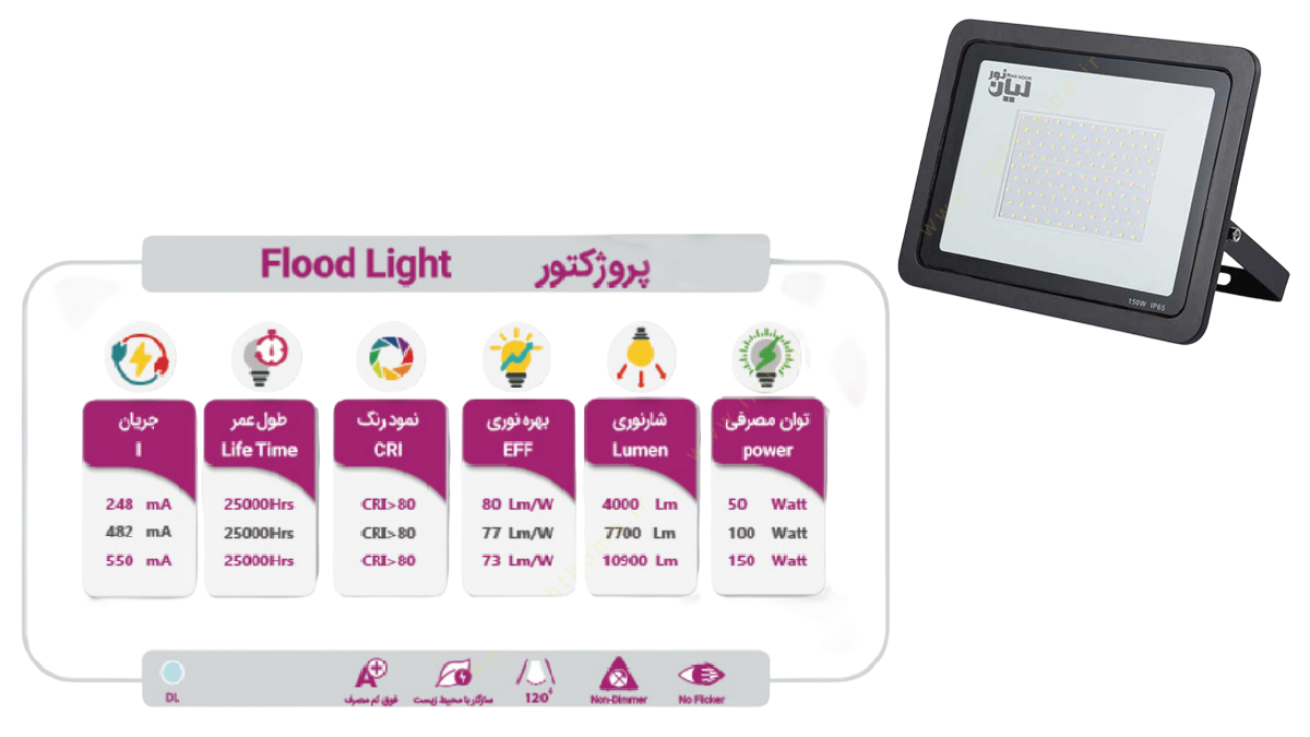 رنگ نوری که لیان نور برای پروژکتور 150 وات در نظر گرفته است رنگ نور مهتابی است. دلیل تک رنگ بودن نور این پروژکتور این است که این نوع پروژکتور در دسته چراغ های تزئینی نمی باشد و چراغی کاربردی است و به دلیل اینکه برای روشن کردن فضاهای بزرگ مورد استفاده قرار می گیرد، رنگ های دکوری برای این پروژکتور مورد استقبال و استفاده مصرف کننده قرار نمی گیرد. طراحی این پروژکتور به گونه ای است که دوستدار محیط زیست و سازگار با محیط زیست می باشد و این محصول فوق کم مصرف می باشد و دارای رده انرژی A+ است و از طول عمر بالایی برخوردار است، طول عمر این محصول 500000 ساعت است و این طول عمر به این معنی است که پروژکتور 150 وات در این مدت زمان دچار سوختگی و یا افت نور دهی نمی شود.